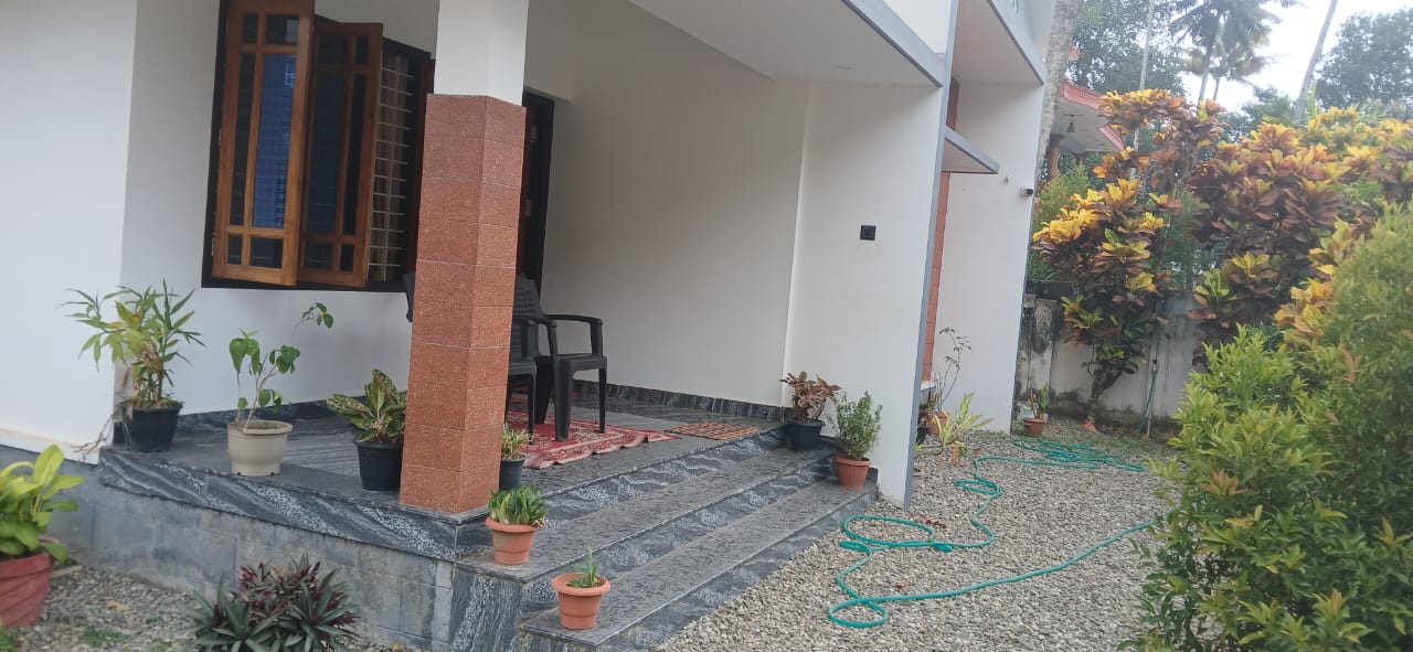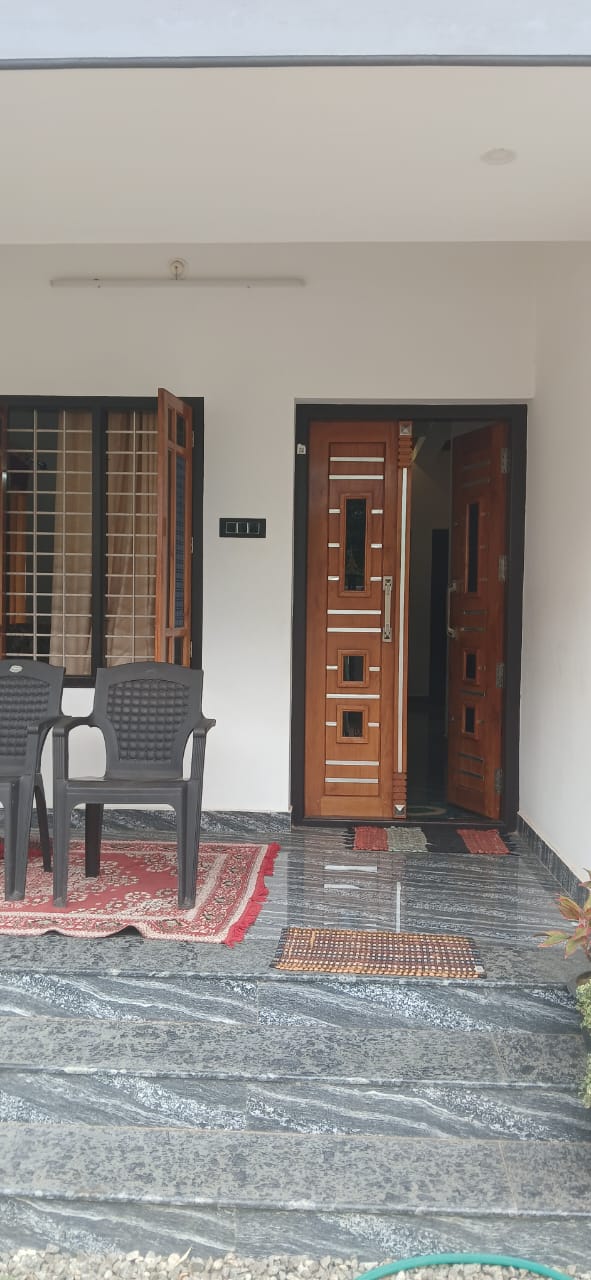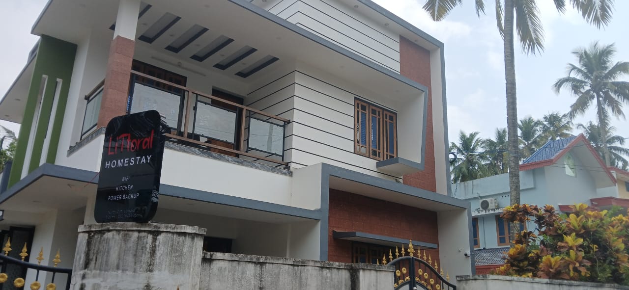 This is a comfortable 3-bedroom homestay located in Varkala. The house has a neat, modern look from the outside and a small front veranda area with a few chairs for sitting. The yard has simple landscaping with plants, and palm trees nearby giving a homely ambience to the place.