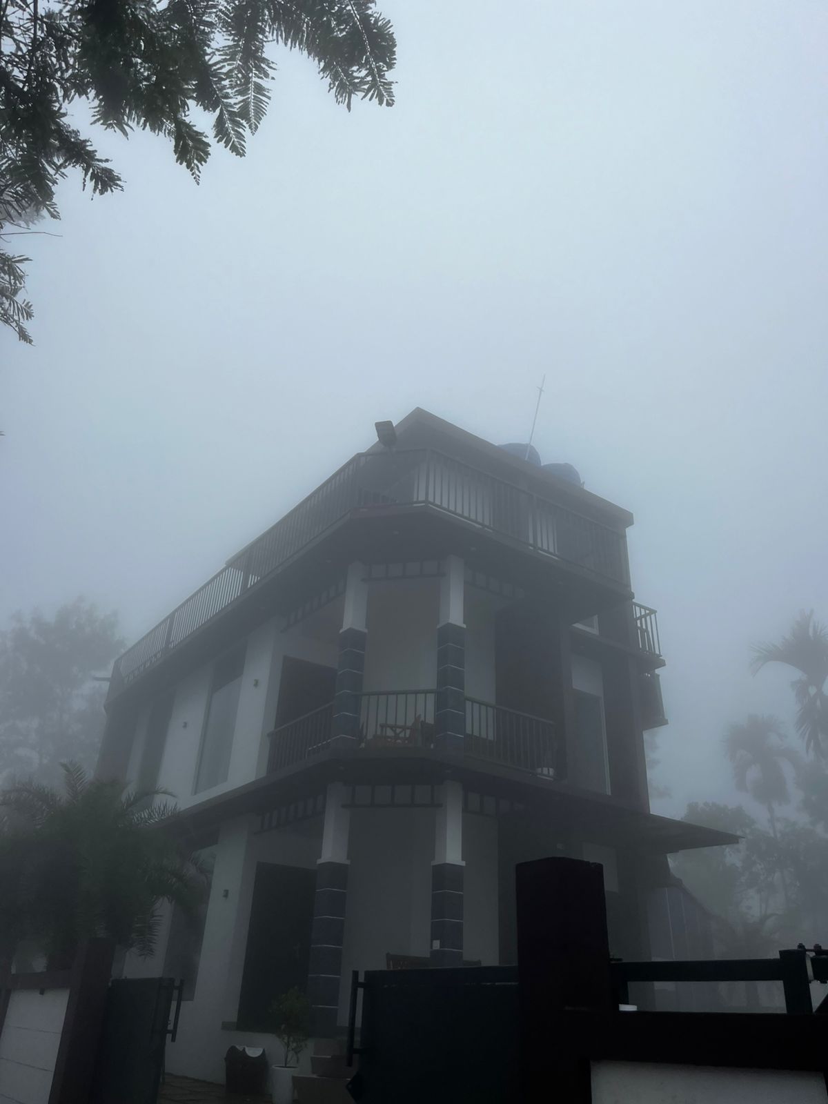 The surrounding area looks very natural and peaceful, with dense trees and an amazing mountain backdrop on a sunny day. Even when it’s misty, the house stands out as a cozy retreat. This property gives you a wonderful combination of modern comforts and beautiful nature. It’s a great spot to enjoy swimming, relax, and enjoy some fresh air.