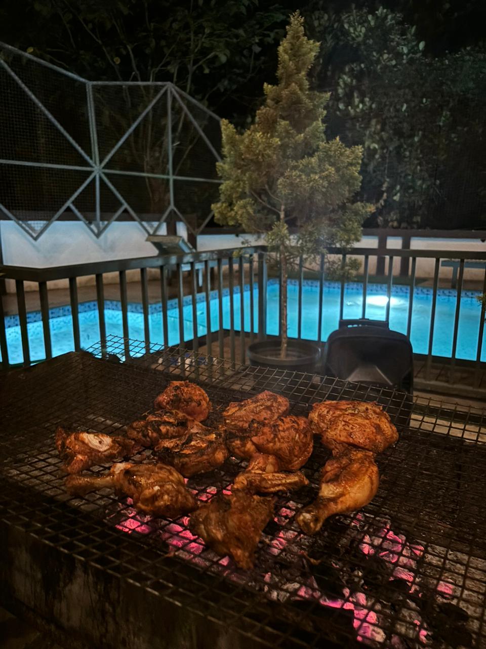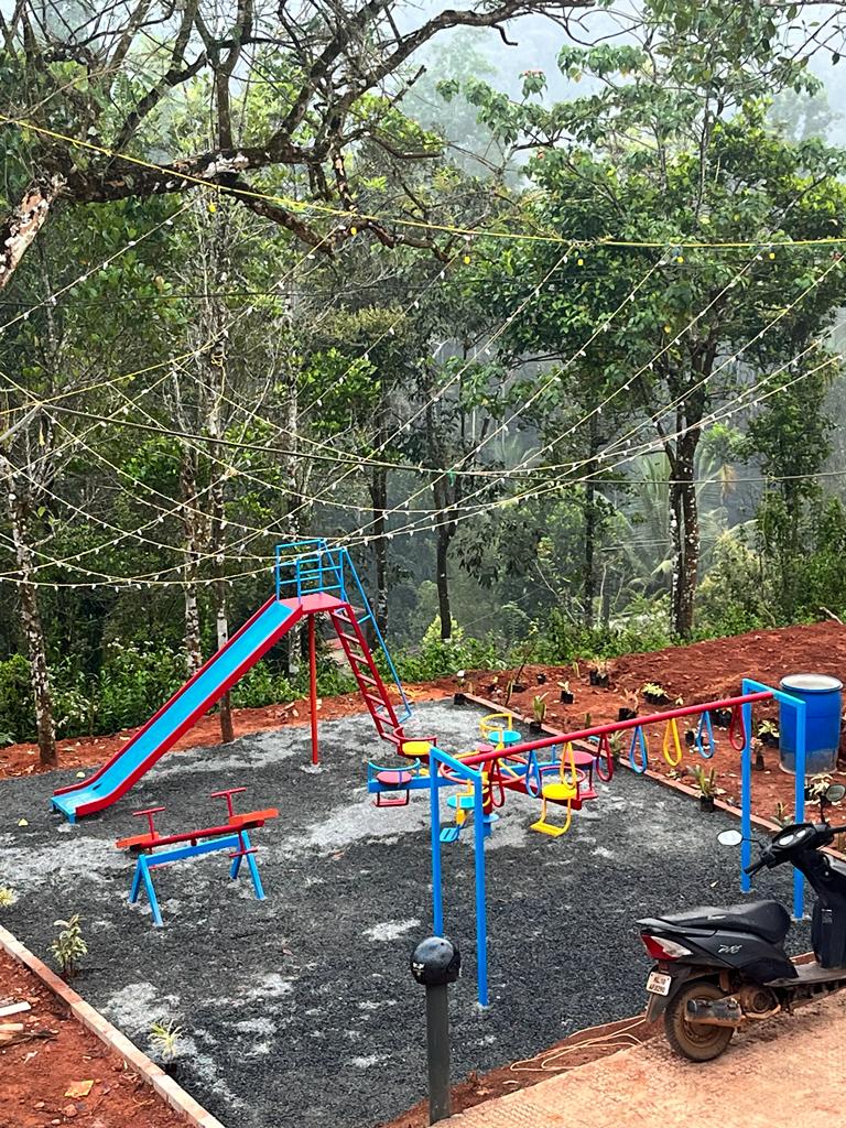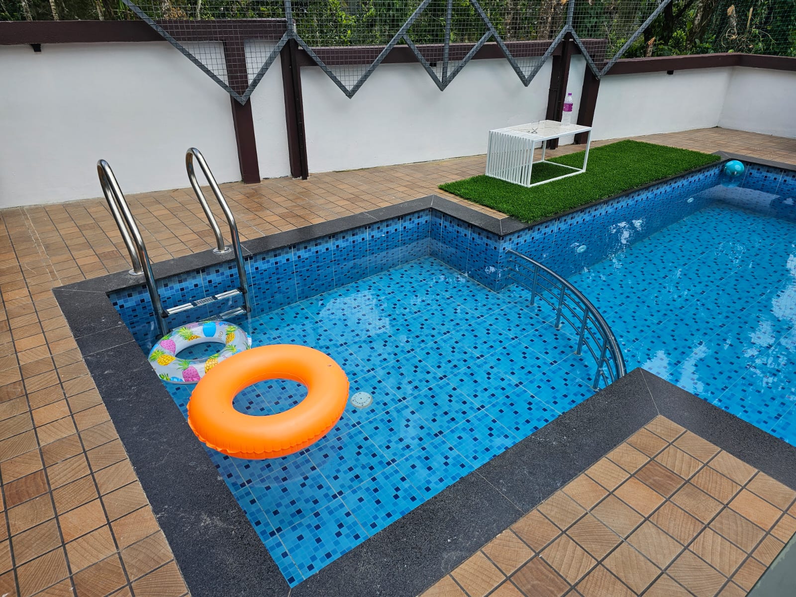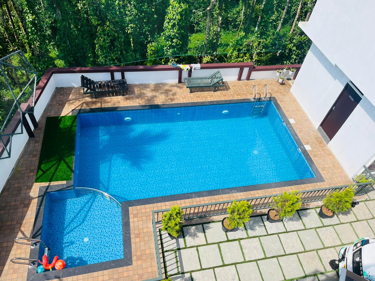 The outdoor swimming pool here has a separate smaller section, ideal for children making this villa a family –friendly stay destination. There are lounge chairs available for sunbathing or relaxing by the pool. The outdoor area is nicely paved with some green patches and potted plants, making it pleasant for sitting outside. Barbecue is available here making this villa suitable for great evening gatherings. For kids, there’s also an outdoor play area with slides, swings, and more.