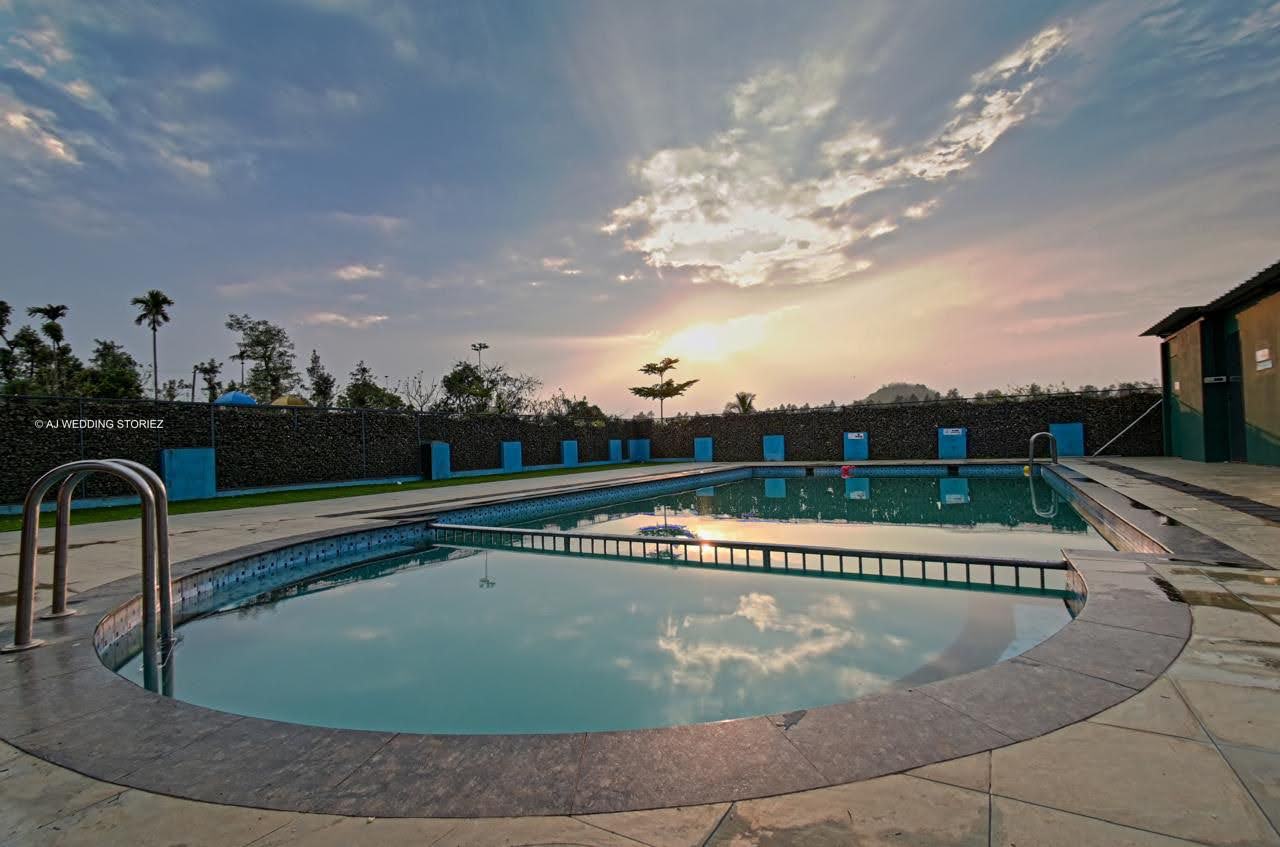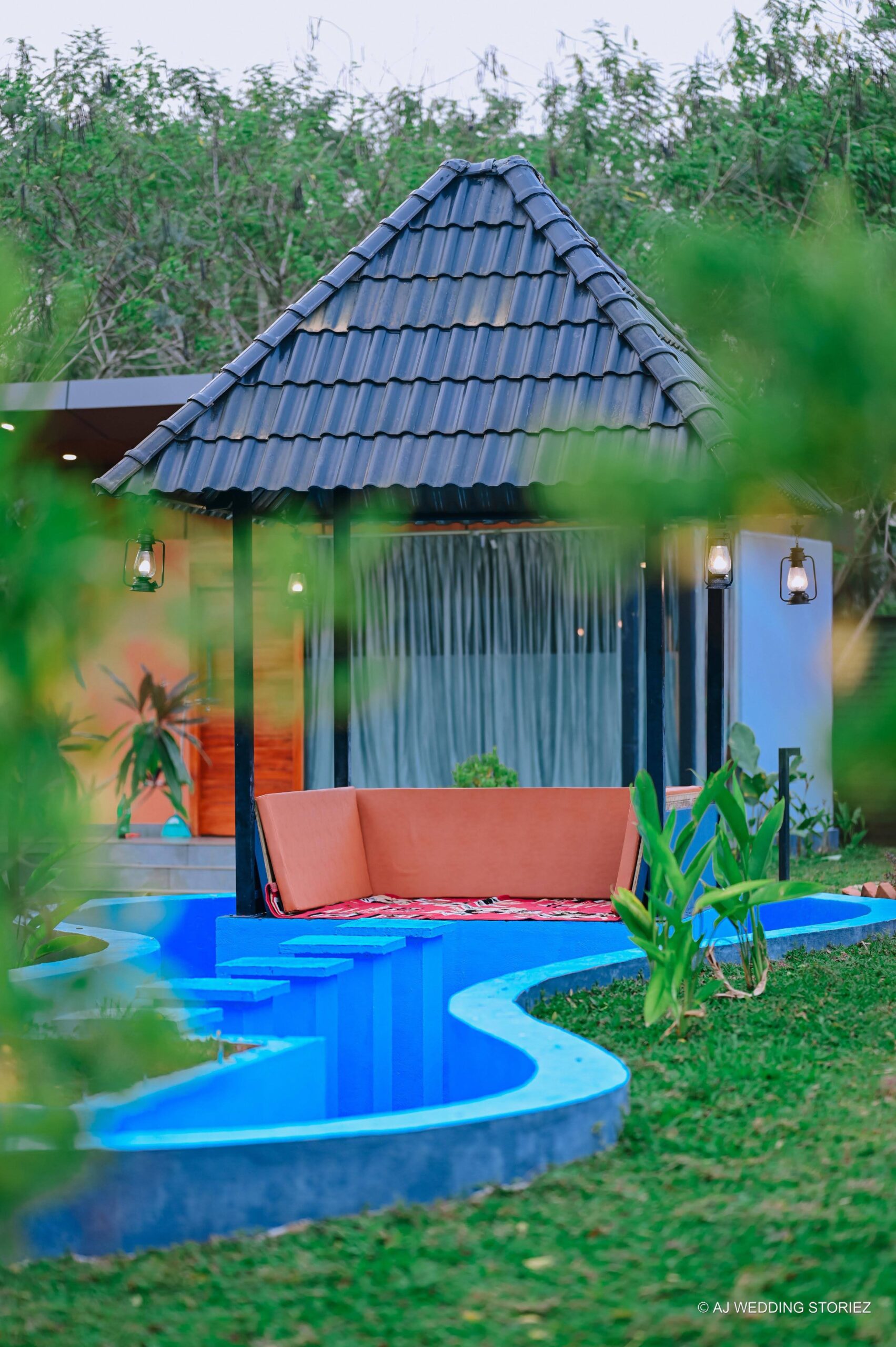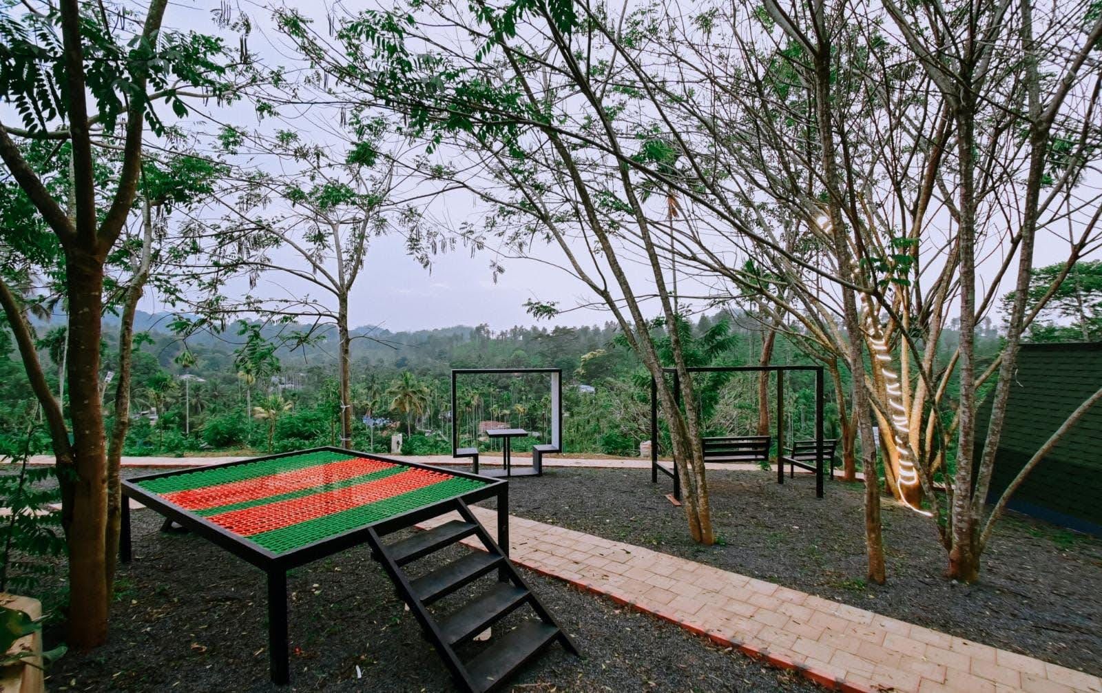 For activities, there is a large swimming pool with blue tiles, perfect for a cool dip while looking at the forest. Outside, guests can relax on a swing set, play games, or have a barbecue at night next to the lighted pool. There is also a neat area with a covered seating spot shaped like a boat for chilling out. Overall, this place provides good space and fun outdoor areas with great scenery for a peaceful and enjoyable stay.