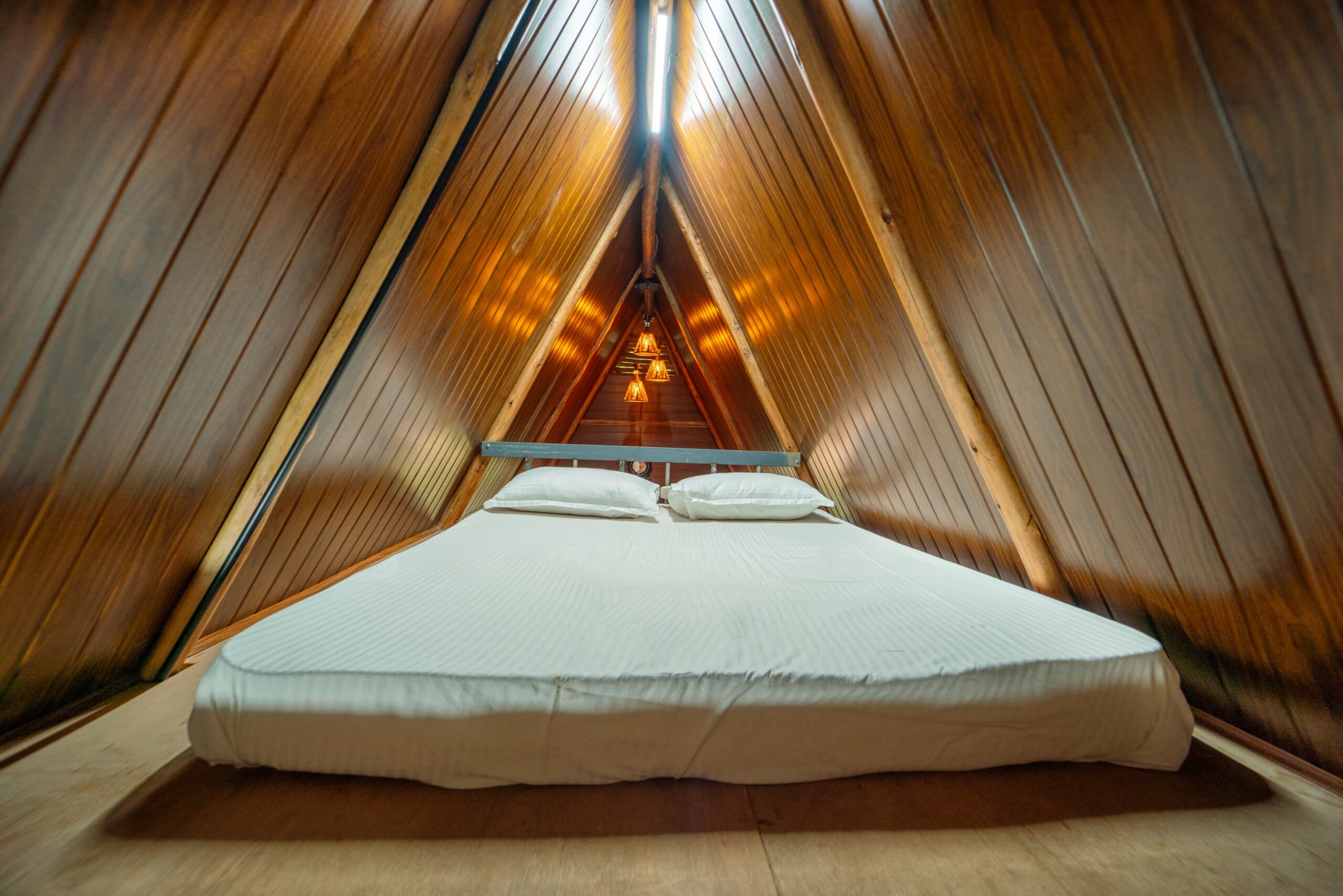 This A-shaped wooden stay structure offers a different stay experience. This cabin is wooden panelled both inside and outside. And all the necessary comforts are provided in a cozy way. The spacious bedroom is clean and well kept, and has a high ceiling which offers more spacious feel. An extra sleeping area is available that is accessible by a ladder, making this stay option convenient for both couples and small groups. The interior also includes a seating area and a small kitchenette. The property also features a fun play area with a wooden swing set, and an outdoor seating area with rustic wooden benches, ideal for a bonfire or a quiet evening under the stars.