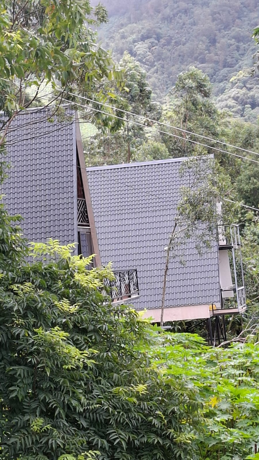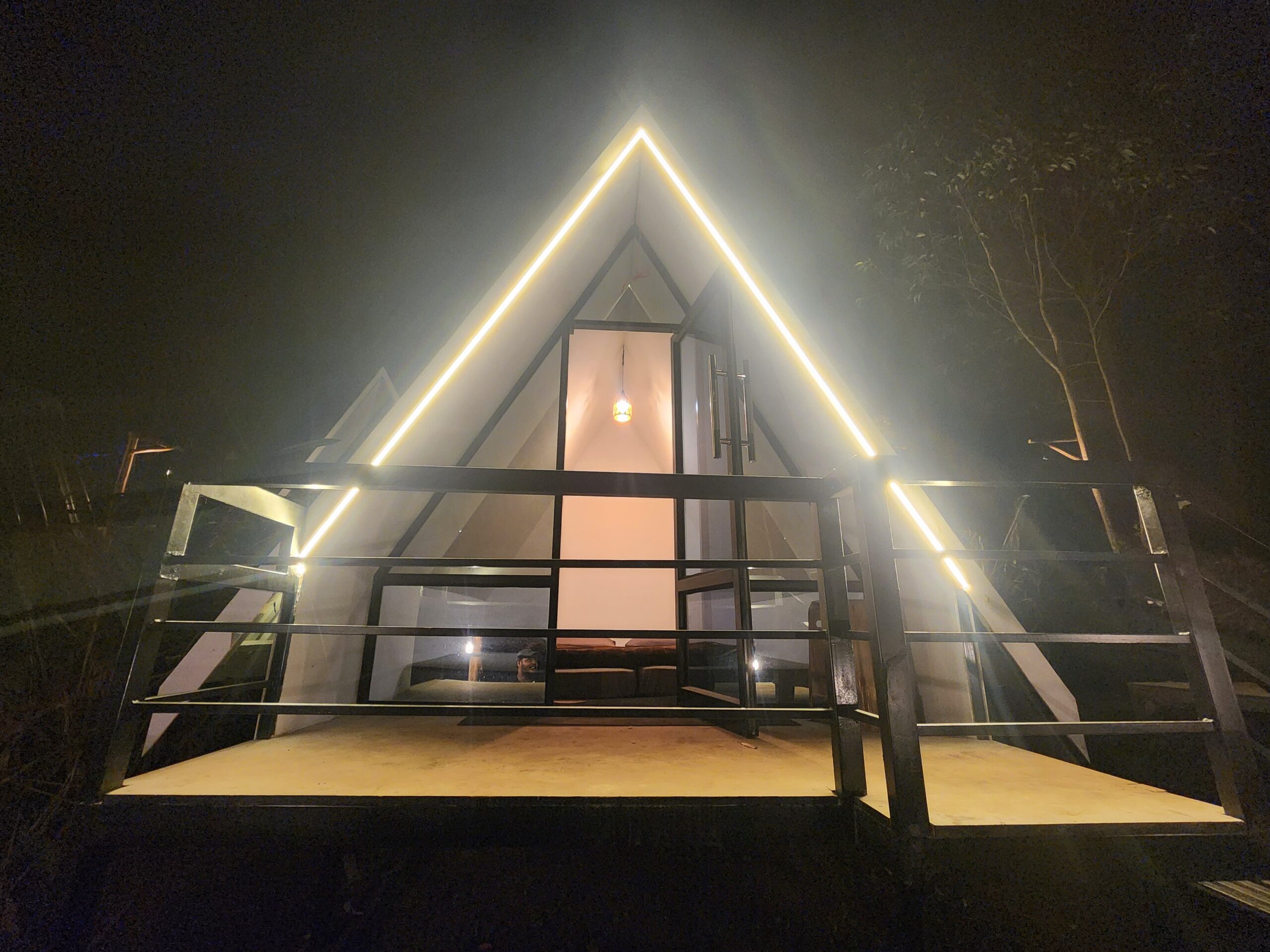 This A-frame campsite in Suryanelli offers a unique stay in modern, A-frame cabins surrounded by the lush green trees. The cabins are elevated on stilts, providing a secluded feel, and are designed with a sleek, minimalist style. Inside, you’ll find a comfortable bed with soft blankets and pillows, perfect for a cozy night’s sleep. As night falls, the cabins and surrounding area are beautifully lit with bright LED strips and warm string lights, creating a magical, welcoming atmosphere. The property’s design is especially stunning at night, with the glowing A-frames standing out against the dark, misty backdrop of the forest.