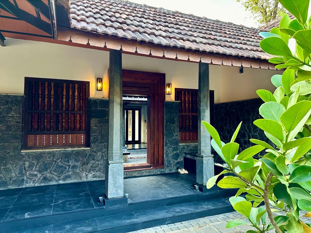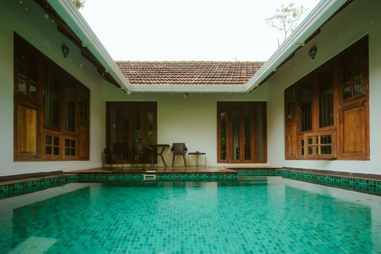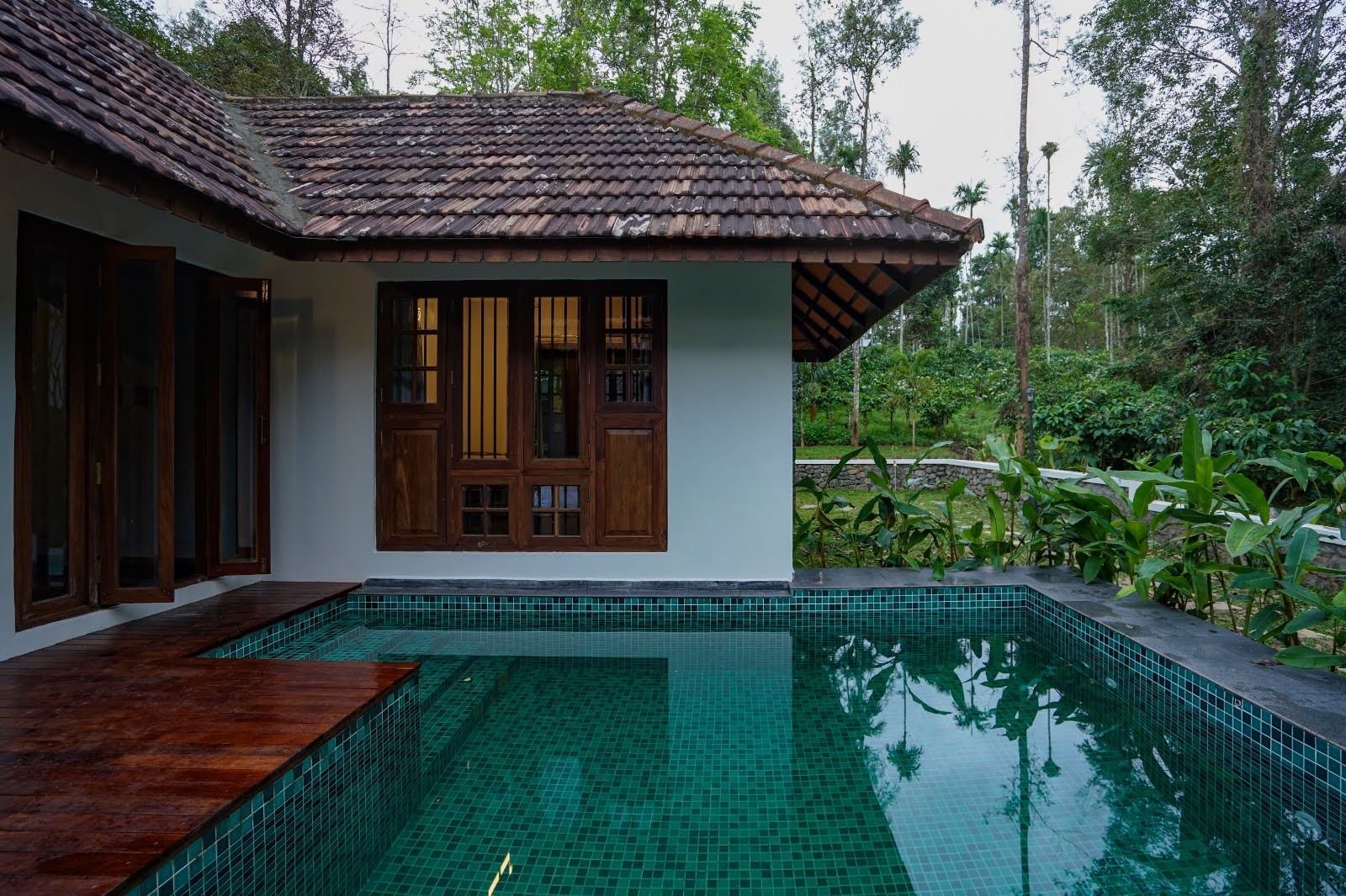 This Traditional Boutique Pool Villa in Wayanad is a must visit place if you want to stay in a place that mixes old style [ naalukett home architecture ] with modern amenities. The exterior has a structure of older Kerala homes, set among lots of green trees, giving it a calm, natural feel.