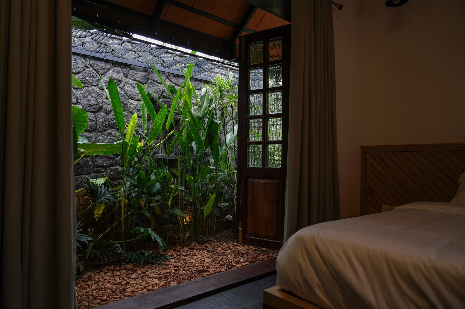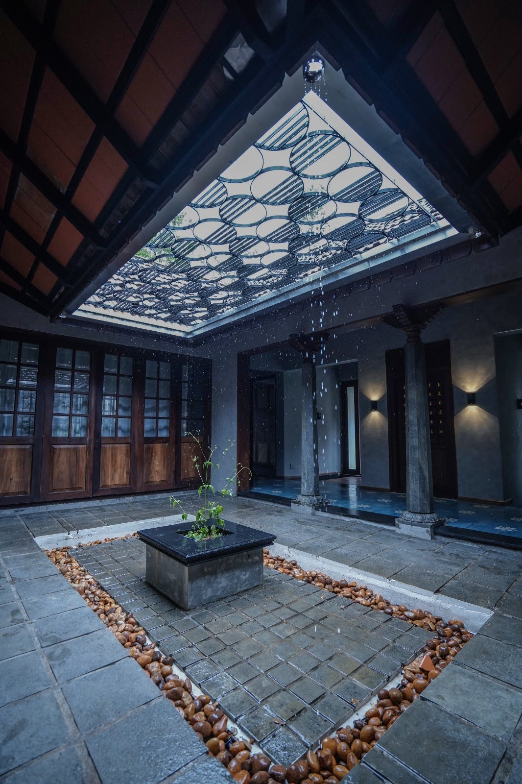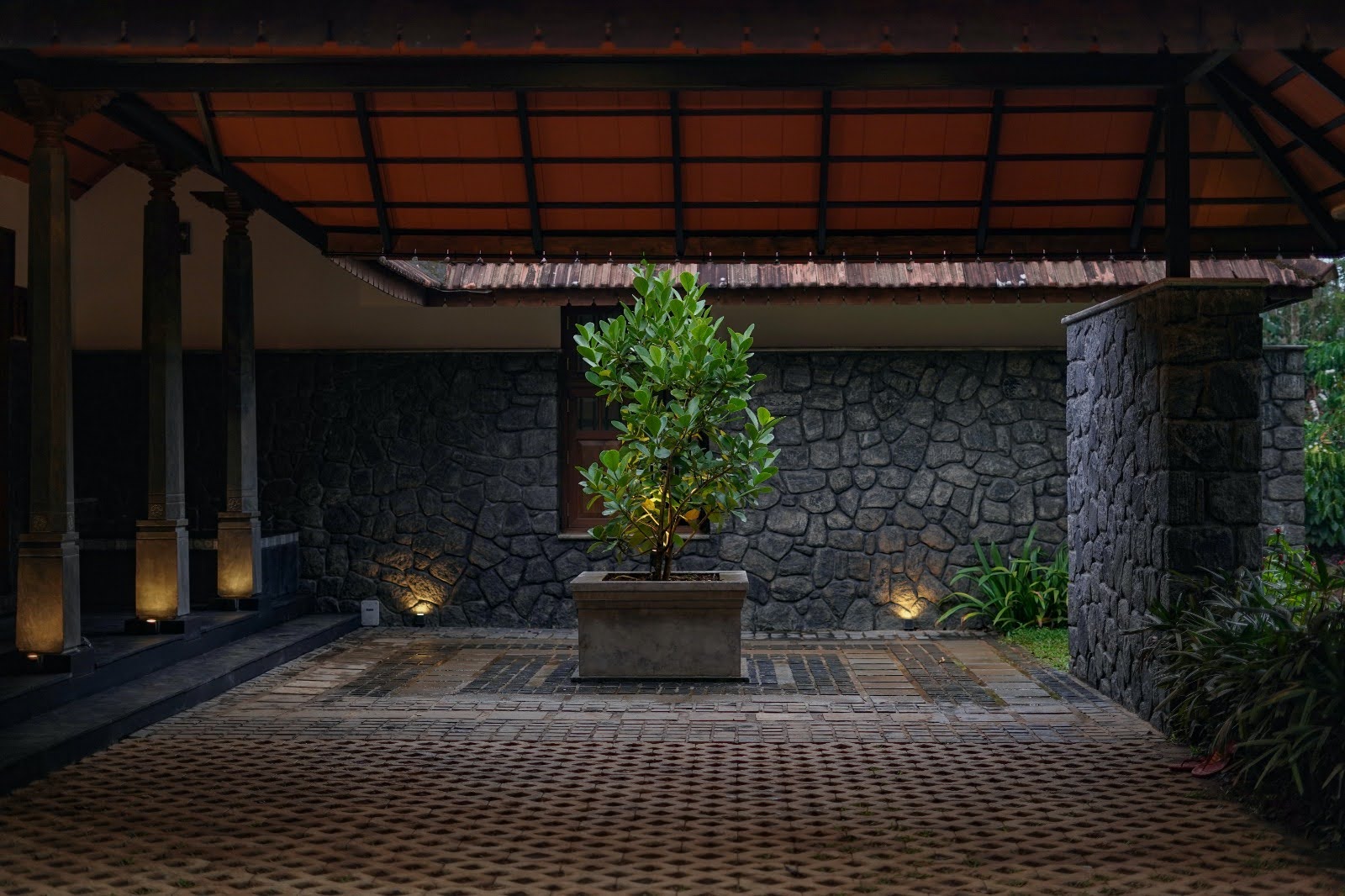 This Traditional Boutique Pool Villa in Wayanad is a must visit place if you want to stay in a place that mixes old style [ naalukett home architecture ] with modern amenities. The exterior has a structure of older Kerala homes, set among lots of green trees, giving it a calm, natural feel.