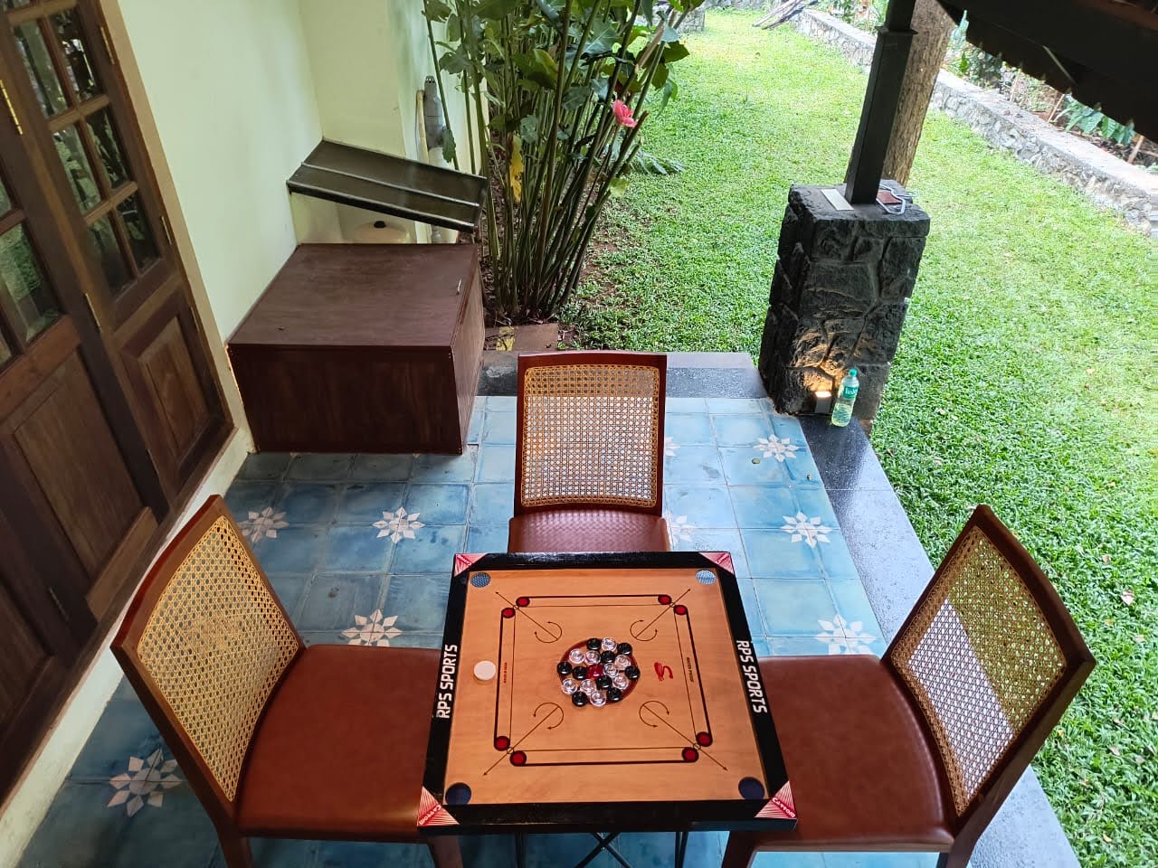 The bedrooms are cozy, with nice wooden bed frames and simple, clean bedding assuring a comfortable rest. The property has an outdoor seating area with comfortable chairs where you can relax outside the main living space. This villa successfully combines a traditional look with modern private amenities like the pool, making it a great booking option for a peaceful Wayanad stay.