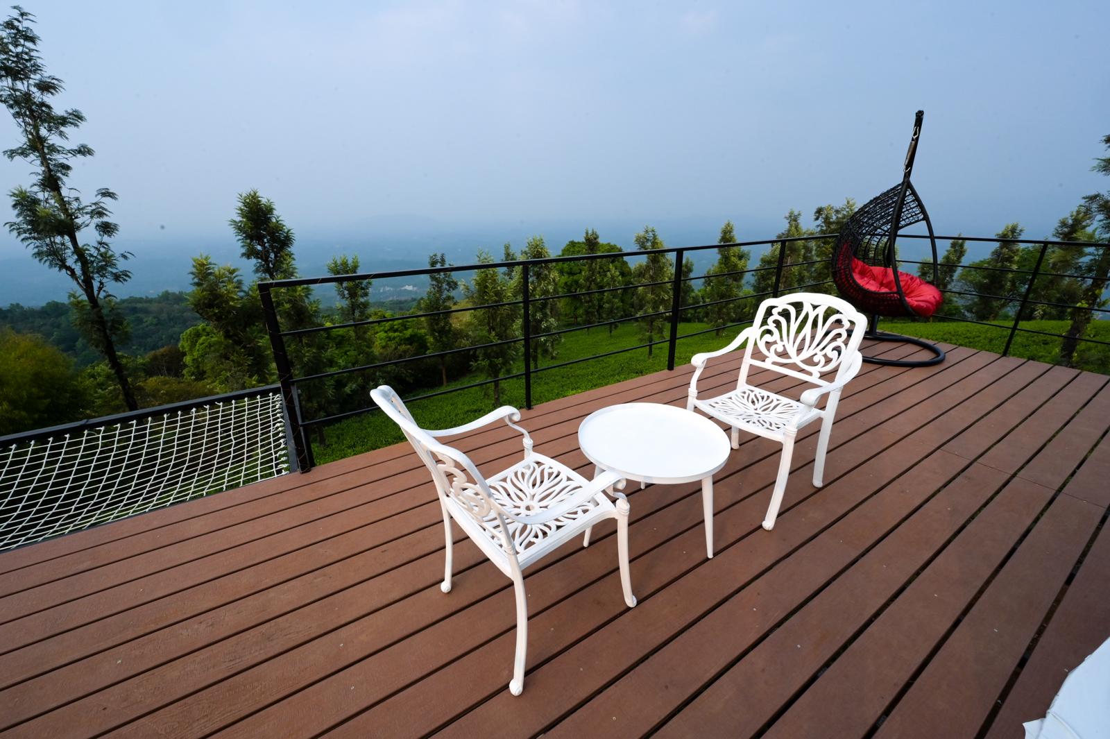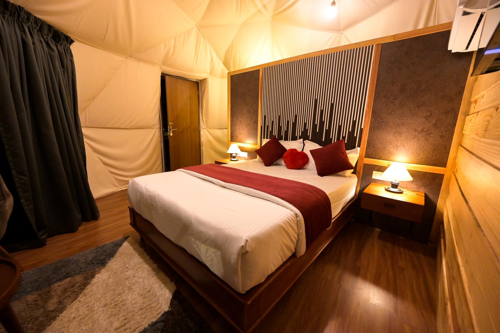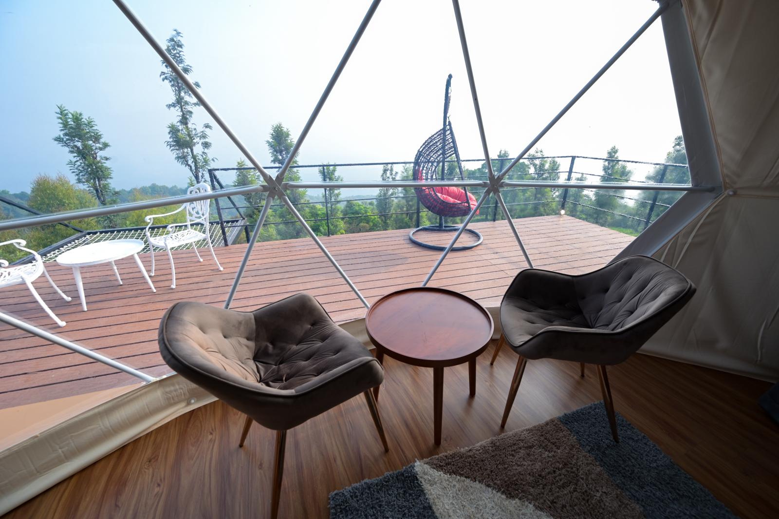 This property has 3 dome stays placed beautifully on the tea plantations of Vythiri in Wayanad. It provides a one-of-a-kind dome stay experience for dome stay lovers. The accommodation consists of luxurious glamping domes, each featuring a private space where you can enjoy the stunning views of the surrounding tea plantations and hills. The interior is spacious and well-lit, furnished with a comfortable bed, cupboard, and a kettle.