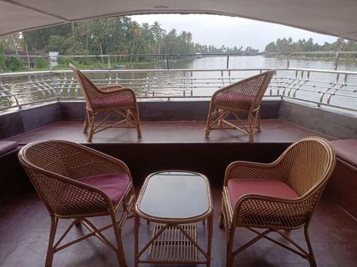 There is a dedicated area at the front of the houseboat with handrails for sightseeing and relaxation. Traditional wooden chairs add charm to the place. Cuisines served are local, authentic foods of Kerala.