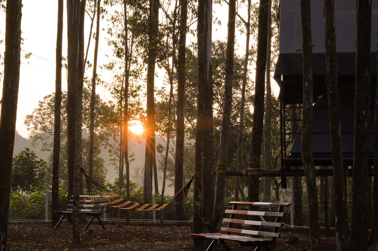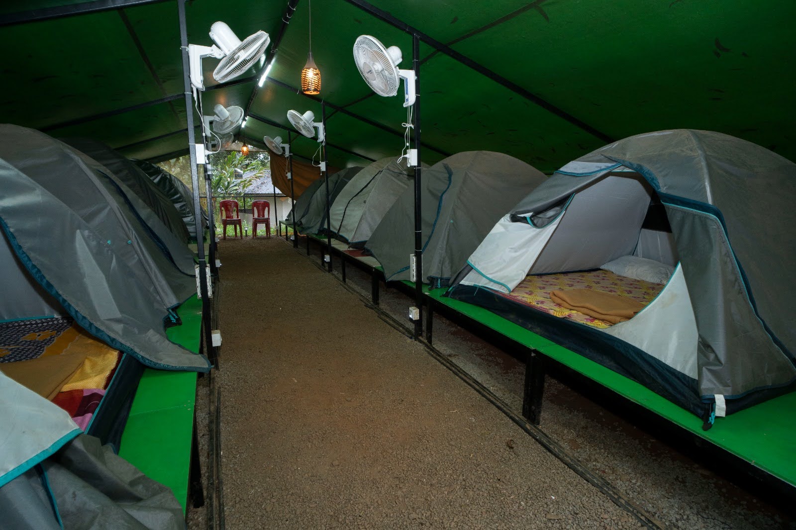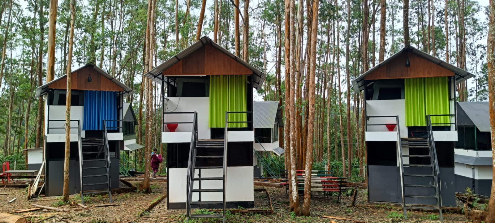 There are common areas available, like a wooden outdoor seating structure that provides shade and a place to gather near the pool. The overall setting is scenic, making it perfect for those who want to spend time outdoors in Munnar with camping. It is a practical and interesting location for a camping.