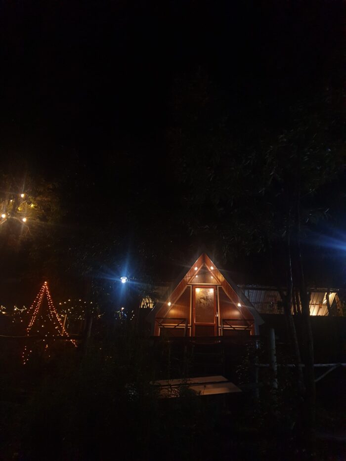 This A-frame campsite in Suryanelli offers a unique stay in modern, A-frame cabins surrounded by the lush green trees. The cabins are elevated on stilts, providing a secluded feel, and are designed with a sleek, minimalist style. Inside, youβll find a comfortable bed with soft blankets and pillows, perfect for a cozy nightβs sleep. As night falls, the cabins and surrounding area are beautifully lit with bright LED strips and warm string lights, creating a magical, welcoming atmosphere. The propertyβs design is especially stunning at night, with the glowing A-frames standing out against the dark, misty backdrop of the forest.