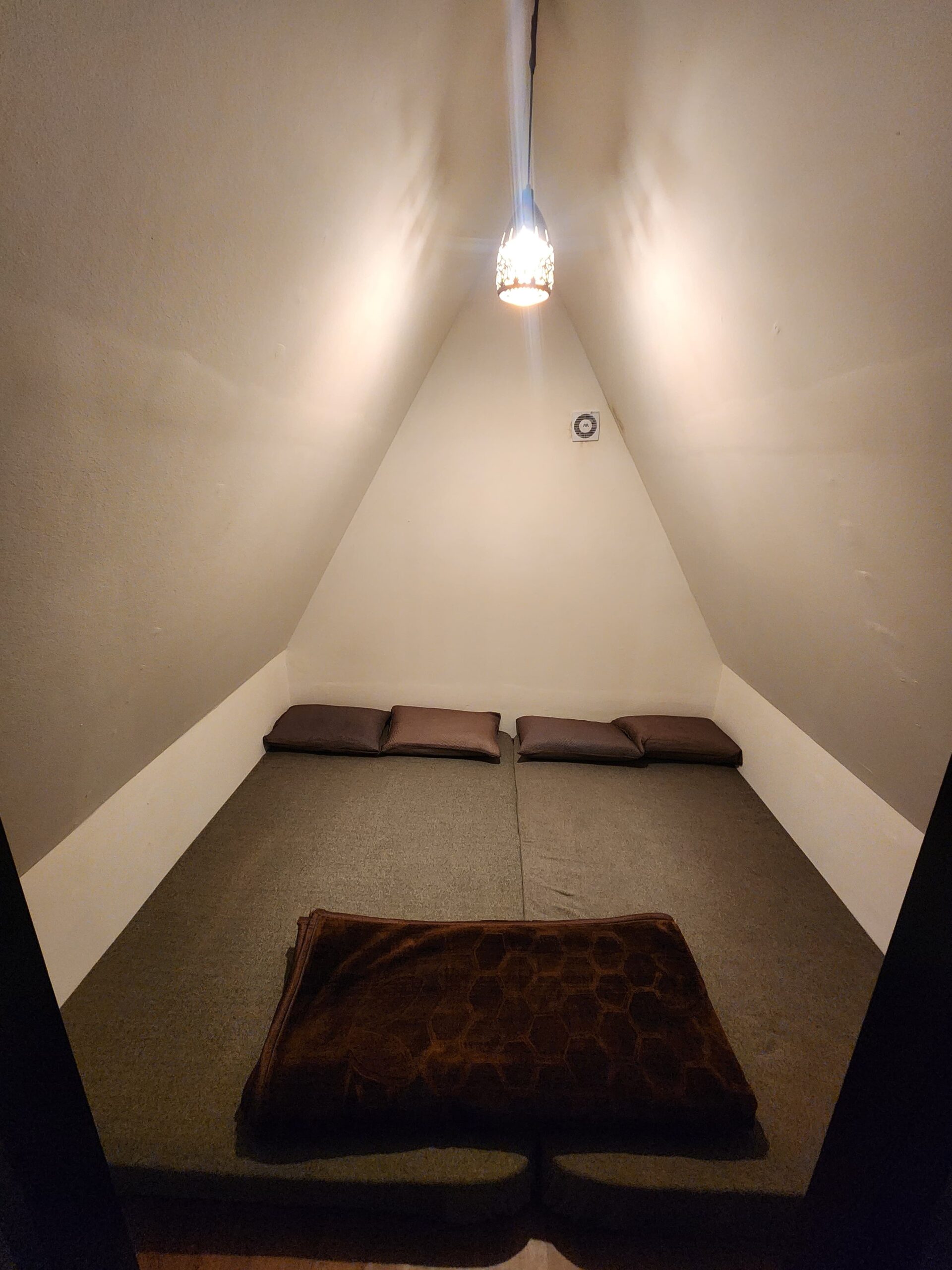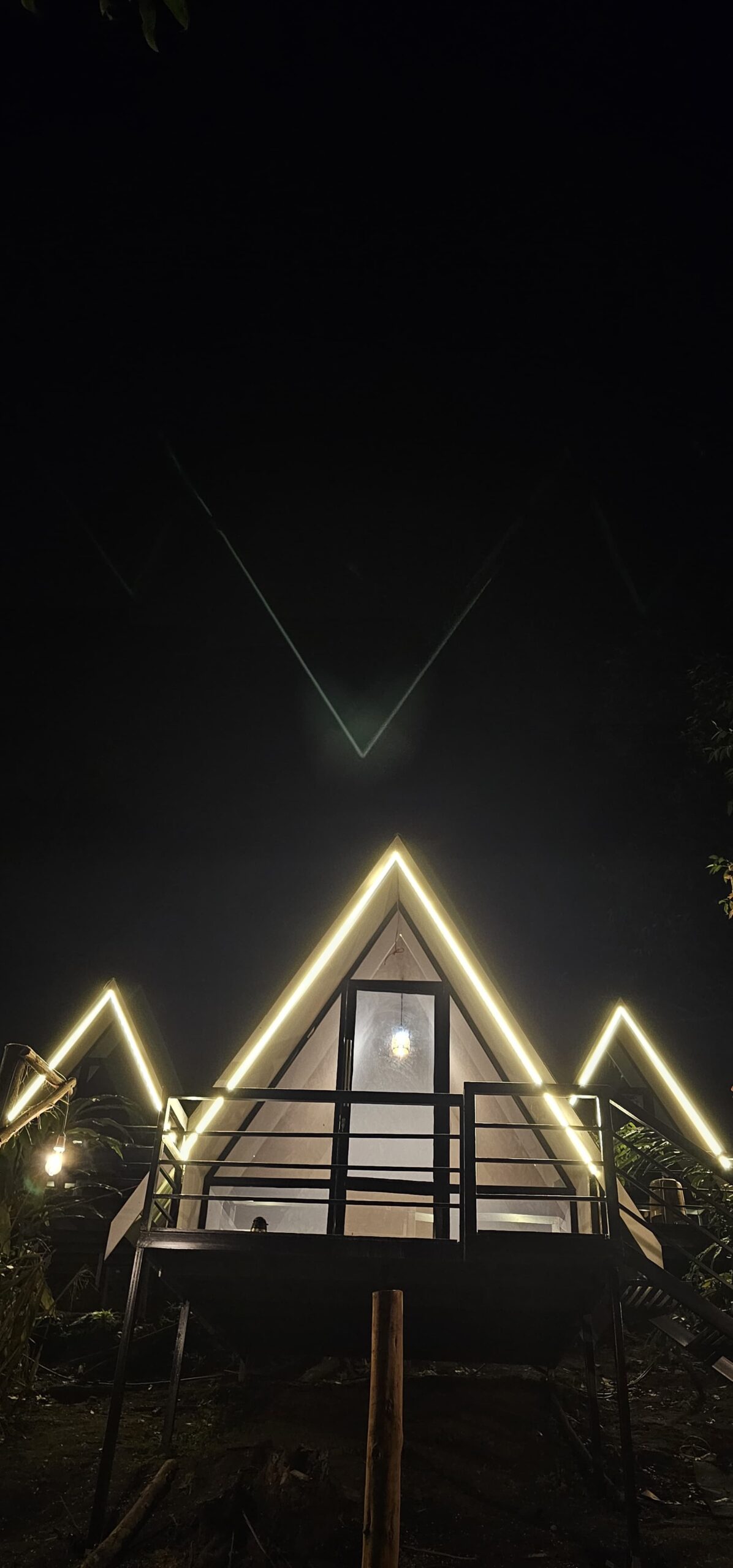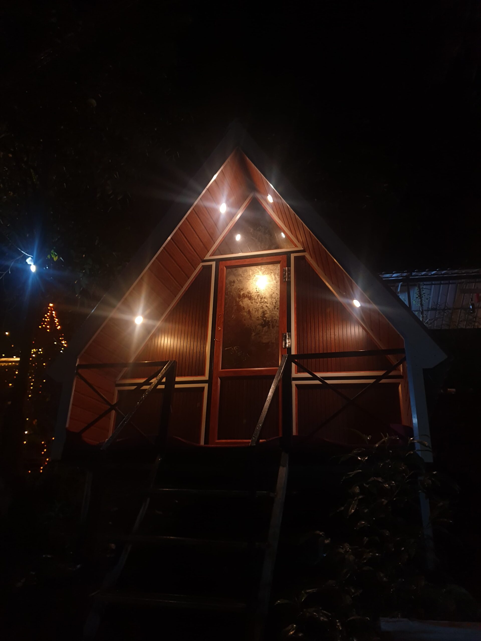 This A-frame campsite in Suryanelli offers a unique stay in modern, A-frame cabins surrounded by the lush green trees. The cabins are elevated on stilts, providing a secluded feel, and are designed with a sleek, minimalist style. Inside, you’ll find a comfortable bed with soft blankets and pillows, perfect for a cozy night’s sleep. As night falls, the cabins and surrounding area are beautifully lit with bright LED strips and warm string lights, creating a magical, welcoming atmosphere. The property’s design is especially stunning at night, with the glowing A-frames standing out against the dark, misty backdrop of the forest.