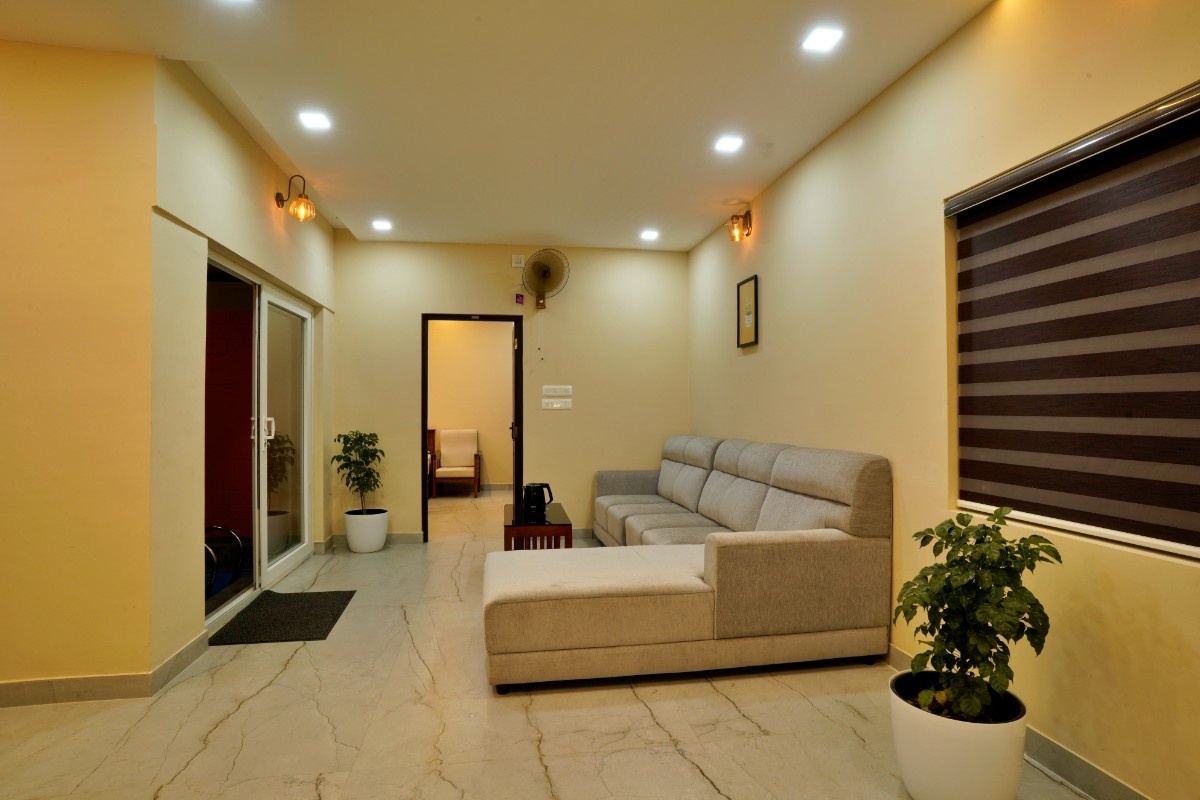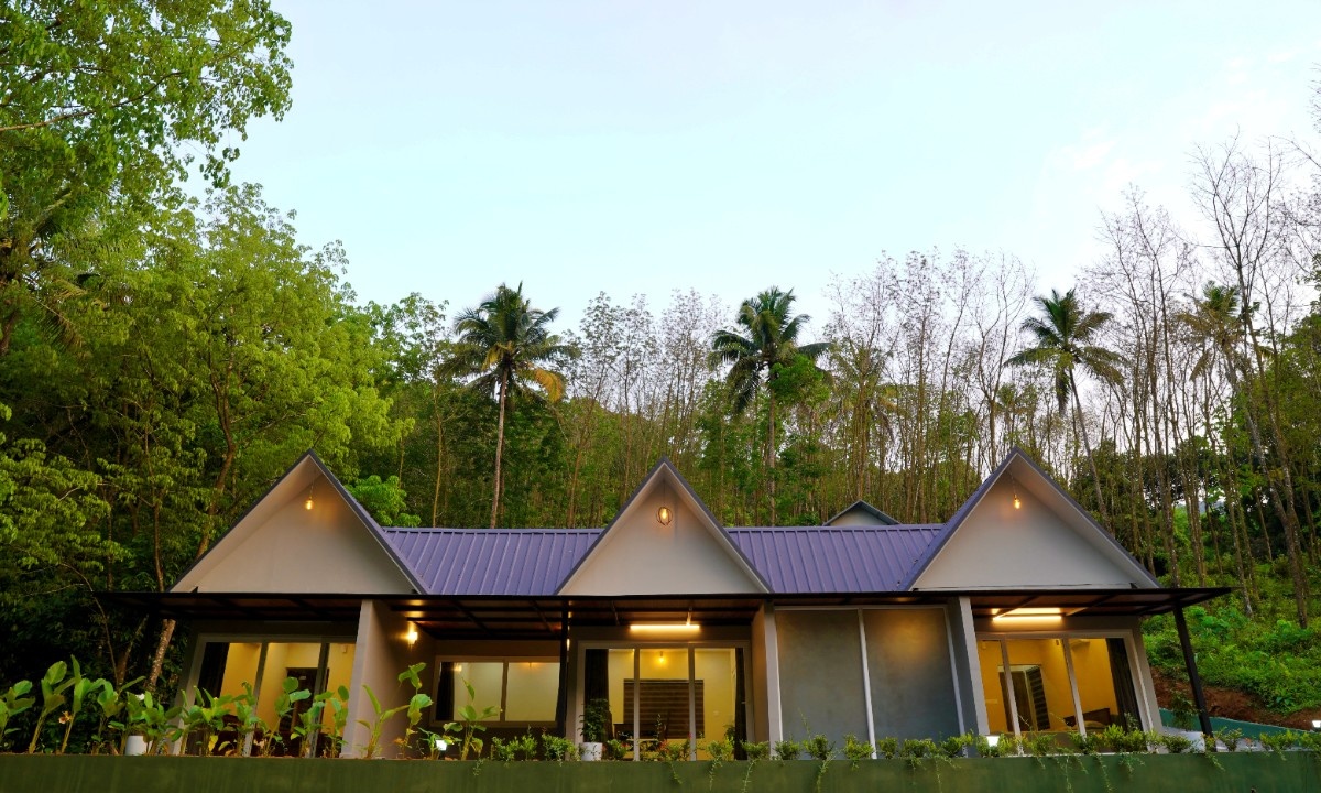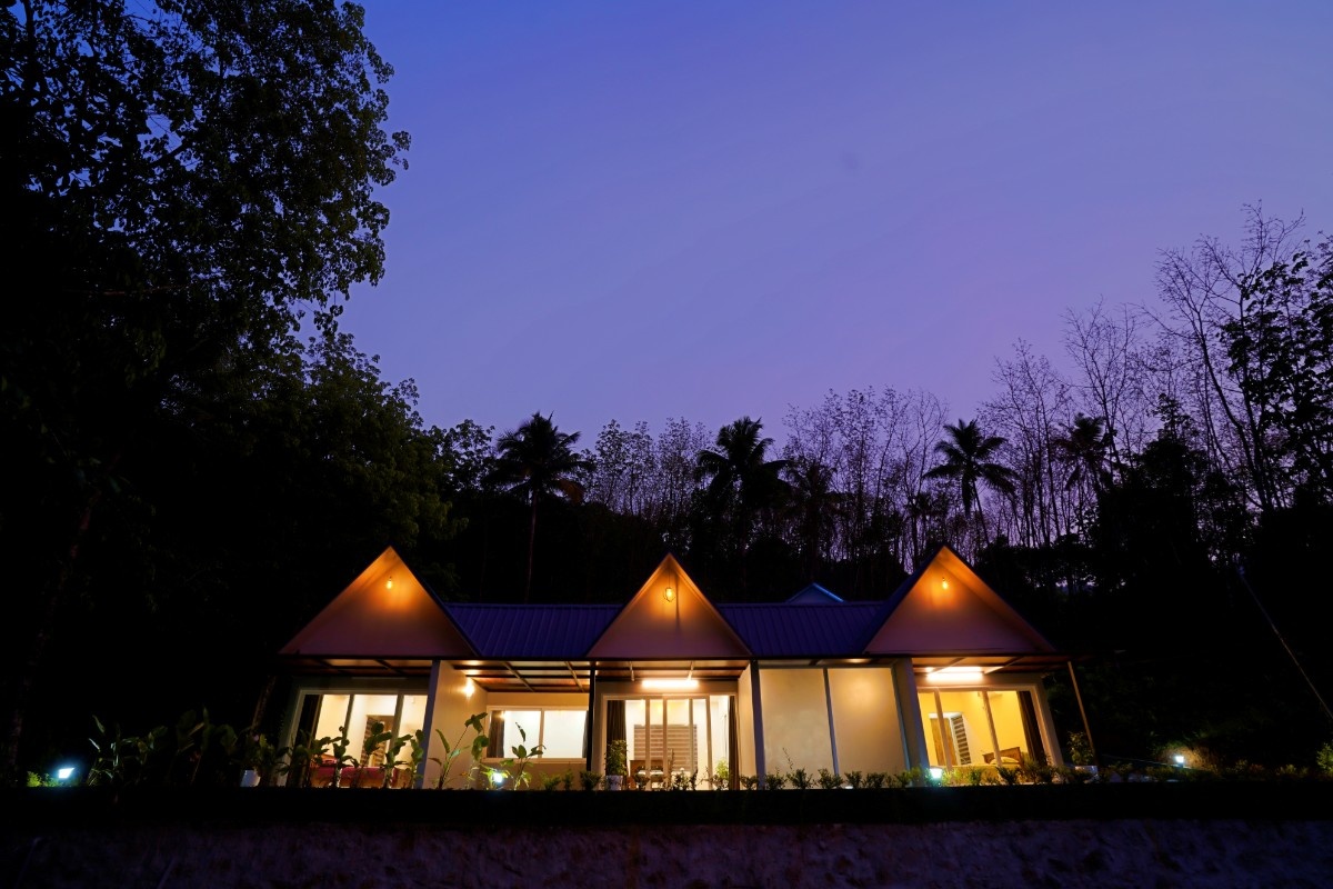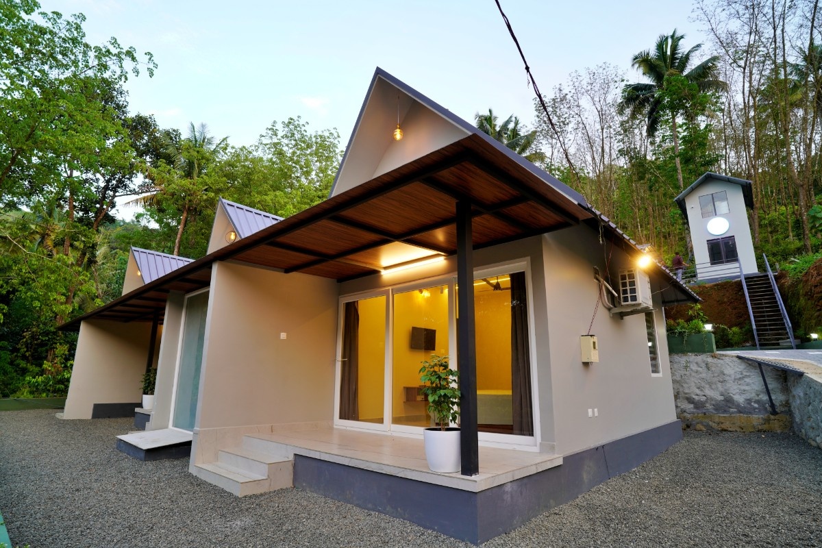 This property is in a quiet green area in Anakulam, Munnar. The houses are simple and modern with gray outside walls and pointed roofs. During the day, they look nice with the trees around them. At night, lights make them glow and look very welcoming. Overall it has a cool nature ambiance suitable for a peaceful stay.