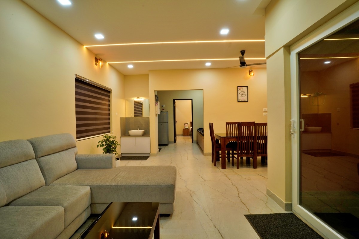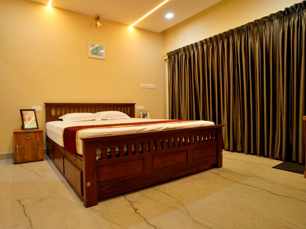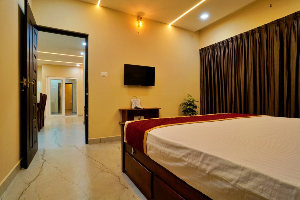 This property is in a quiet green area in Anakulam, Munnar. The houses are simple and modern with gray outside walls and pointed roofs. During the day, they look nice with the trees around them. At night, lights make them glow and look very welcoming. Overall it has a cool nature ambiance suitable for a peaceful stay.