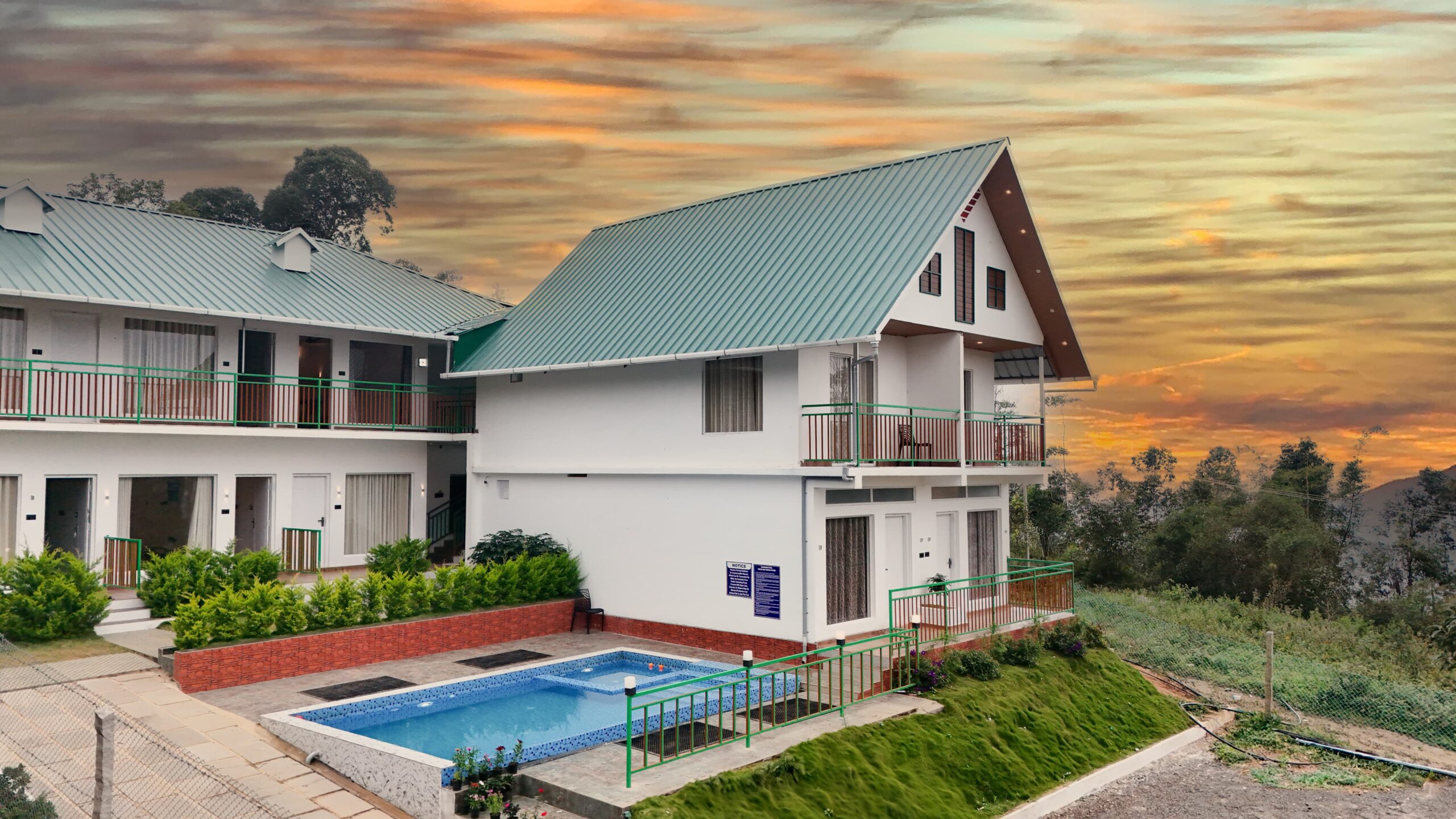 This is a stunning resort located in Suryanelli known for its beautiful ambiance and picturesque setting. This resort offers breath-taking views of the surrounding hills. This resort has a clean outdoor swimming pool where guests can take a dip and enjoy the scenery together. The property has a contemporary architecture and has green roof that blends with the green nature surroundings.