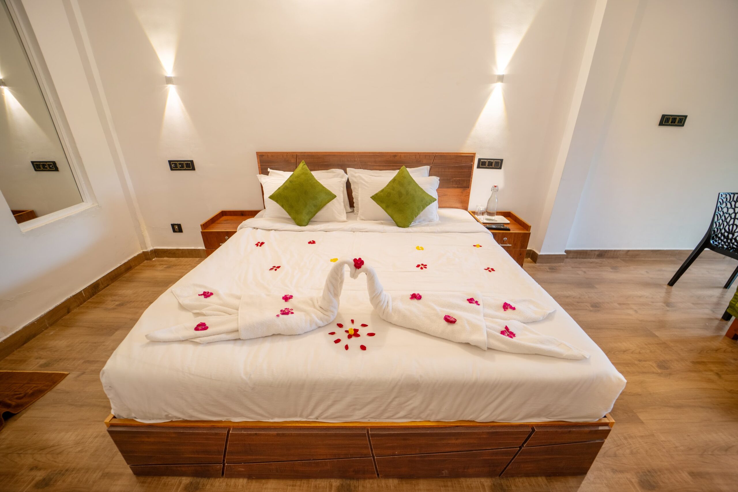 A number of balconies are available here that makes sightseeing even more enjoyable. The outdoor areas are beautifully paved and include a well-kept lawn and garden. And the indoor floor is wooden polished ones. The indoors feature large floor-to-ceiling windows with spacious bedrooms. Special touches to rooms, especially for couples like honeymoon are provided here.